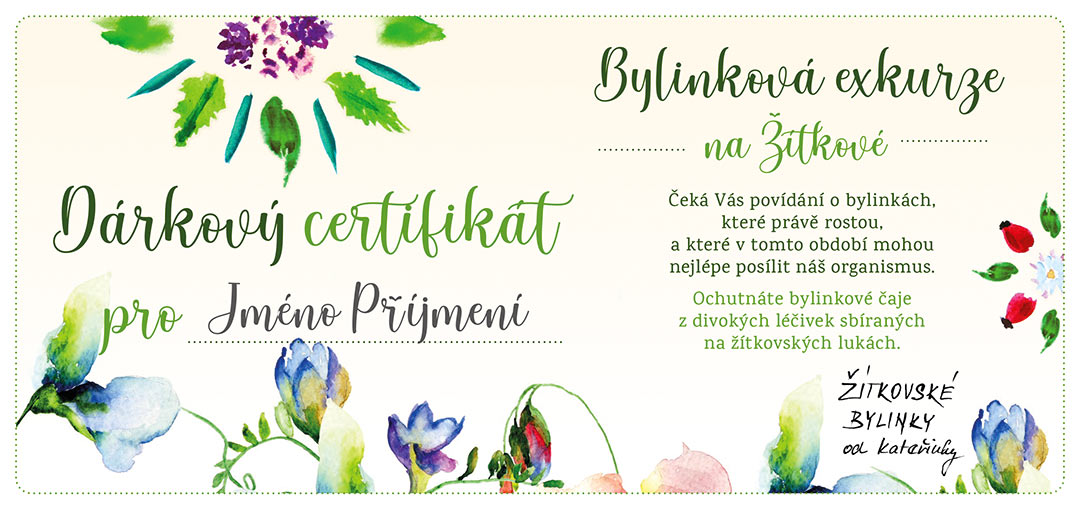 Pokud se Vám moje akce líbí, můžete je darovat svým blízkým či přátelům. Vyberte si bylinkovou exkurzi, pošlete mi email na: odkaterinky@seznam.cz a zašlu Vám vyplněný certifikát.